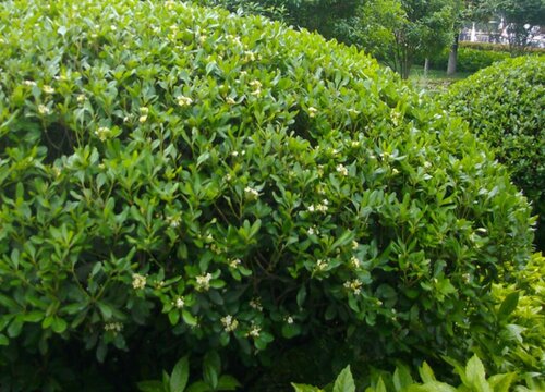 2、海桐球四季常青而具有光澤,5月開花,花白色或淡黃色,開花的時候香氣襲人,觀賞性比較高,在庭院中可植于門旁、窗前,修剪成圓球形,盆栽可以擺放在內(nèi)室或客廳。