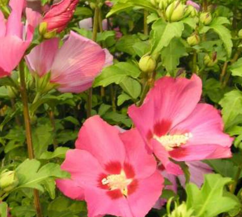 叢生木槿也是灌木,能長3-6米。叢生木槿是木槿的一個變種,其莖直立,有多個分枝,會呈現披散狀,樹皮為灰棕色的,葉為卵形,花單生于葉腋間,花瓣的顏色有淺藍紫色、粉紅色、白色等。