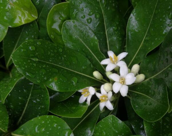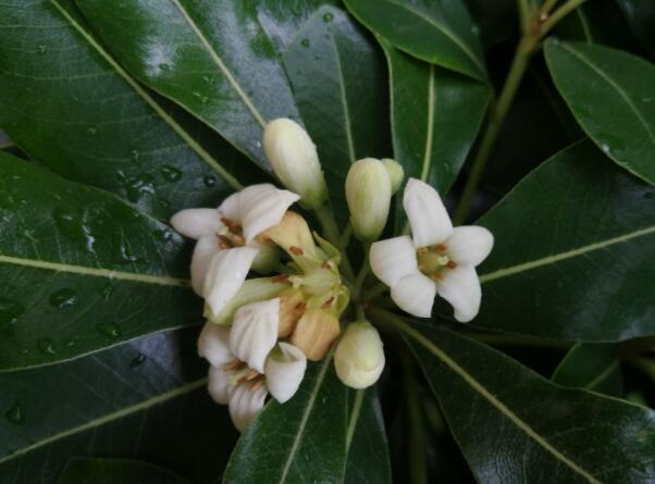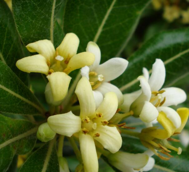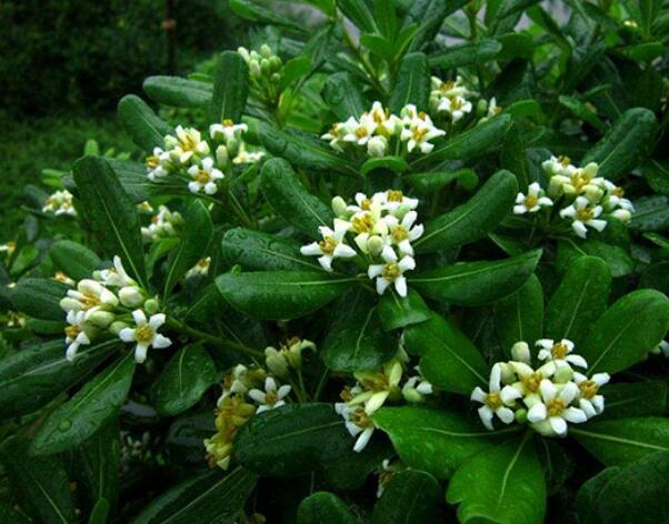 海桐花味道極香,其花為白色或是淡黃綠色,每朵小花有5片花瓣。海桐花也屬于是常綠的灌木,其葉互生,并且皮嫩有光澤,其花序有傘形花序或是圓錐花序。