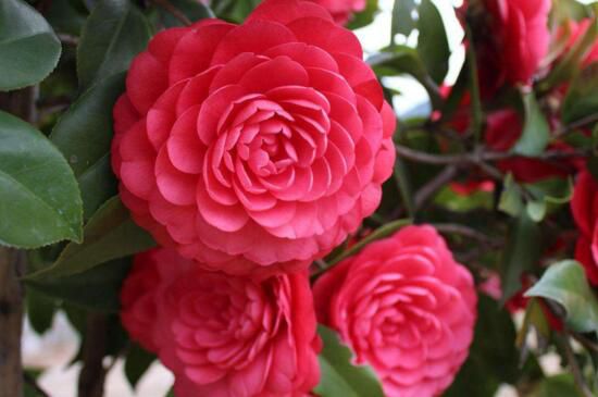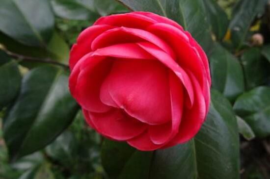 六角大紅山茶花源產地地在浙江松陽,所以也叫松陽紅,花朵碩大且花瓣繁多,花瓣大多呈六角形瓦片狀排列,整個花朵看起來層次感很強,花色只有大紅色,極其艷麗,花期較長,在12~4月份。