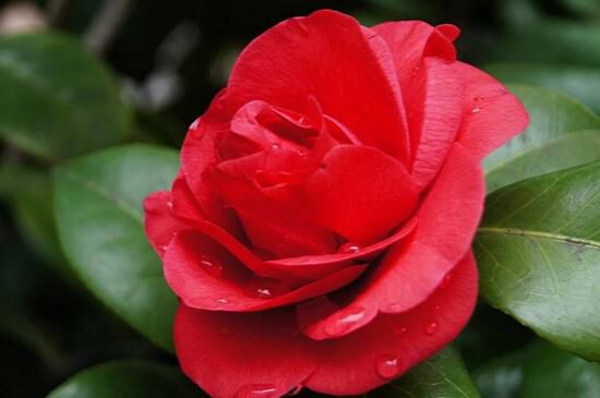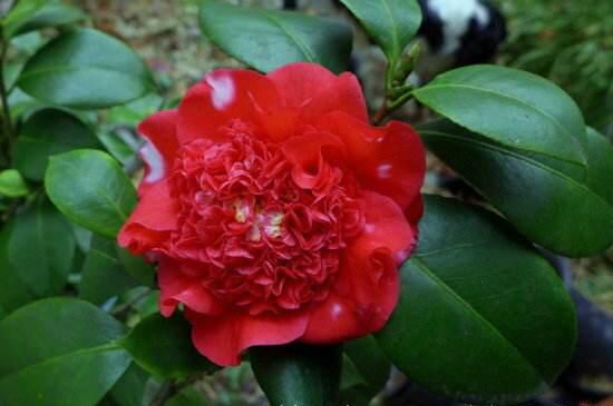 火瀑布山茶花,看其名能想到其花色肯定是如火般鮮艷的紅,花朵碩大為牡丹花型,外部花瓣包圍著內部緊簇生長的花瓣,有如灑上去的白色斑點,花期較長在1~4月份。